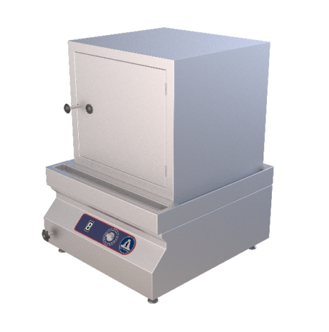 Glacies Tandoor is constructed of AISI304 Food Grade Stainless Steel. It is built with an internal frame structure of vertical Square Pipe 40x40x1.5mm THK and cross members of Angle 32x32x3mm THK. The internal frame is cladded with stainless steel 1mm THK sheet on the sides and rear, and the front is cladded with stainless steel sheet of 1.2mm THK. The top panel is removable and is 1.5mm THK with a splash and double beaded on all sides. The top panel is provided with a cut out of Ø375 mm mouth for the clay pot. The clay pot is insulated with glass wool in to a GI drum and further insulated with mud within the drum. Four quantity of all swivel heavy duty castor wheels, two of which are with brakes, are provided for easier movement of the Tandoor. Handle of Ø25×1.5mm THK Pipe is provided on the front of the top panel. The Glacies electrical tandoor works on 440v 3Phase & 12KW.